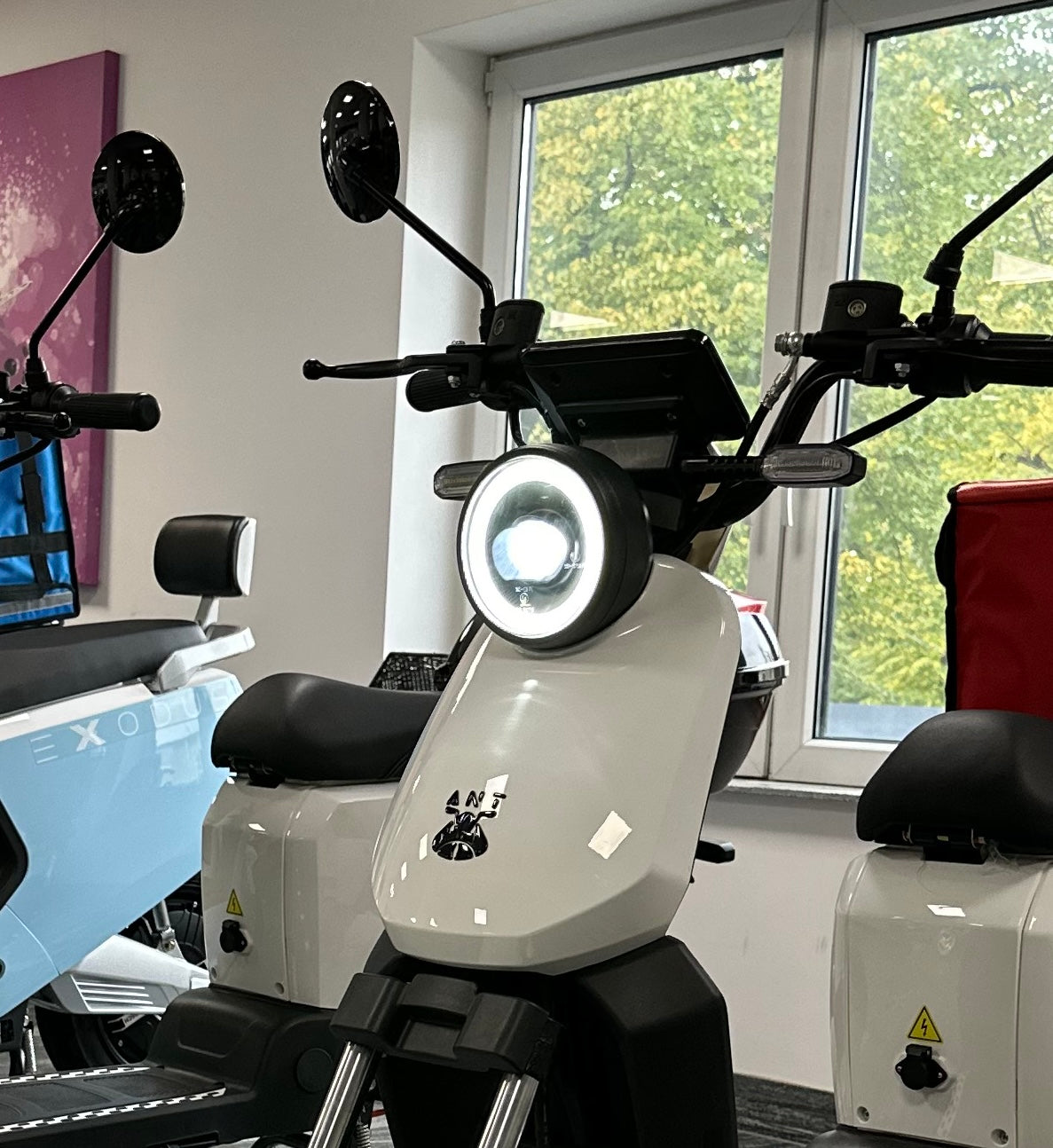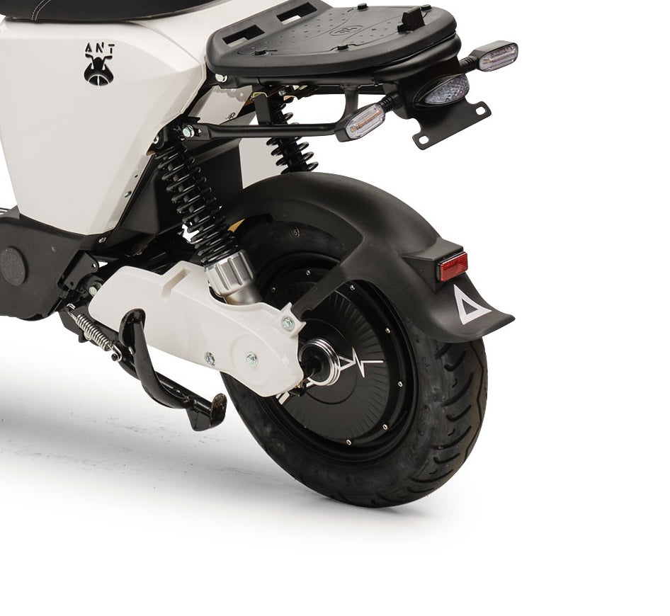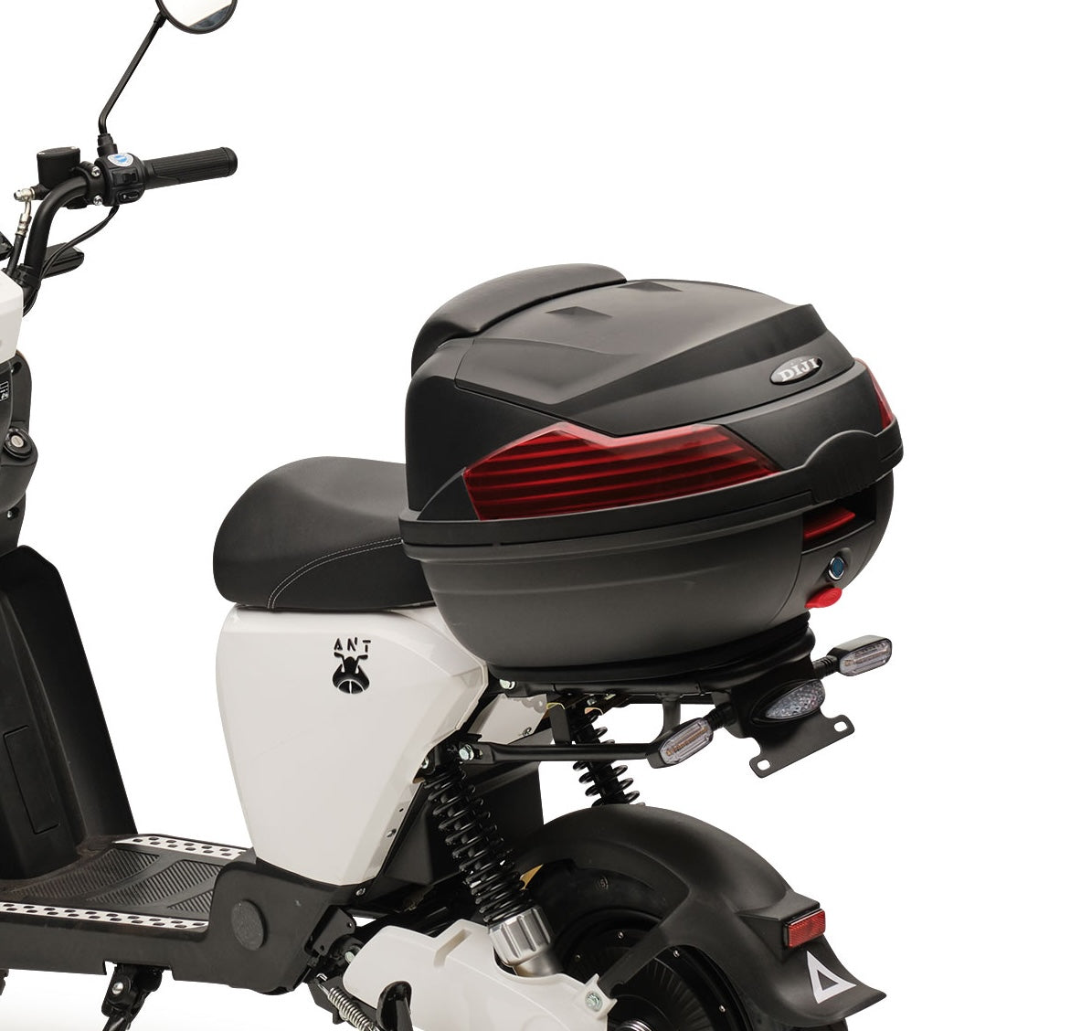 Der Elektroroller ANT besticht mit seiner Leichtigkeit und dem schlichten Design. Serienmäßig sind Zentralzündung, Lenkerschloss, Gepäckhaken, Haupt- und Seitenständer, Tankanzeige, Abblendlicht, Gepäckträger und Sitzbankfach an Bord.