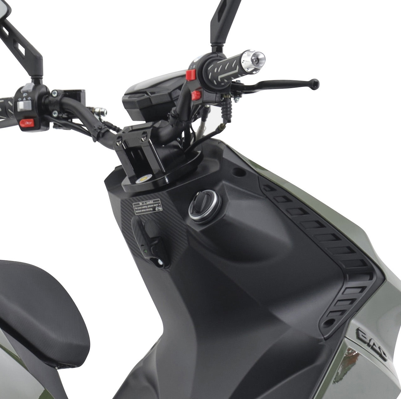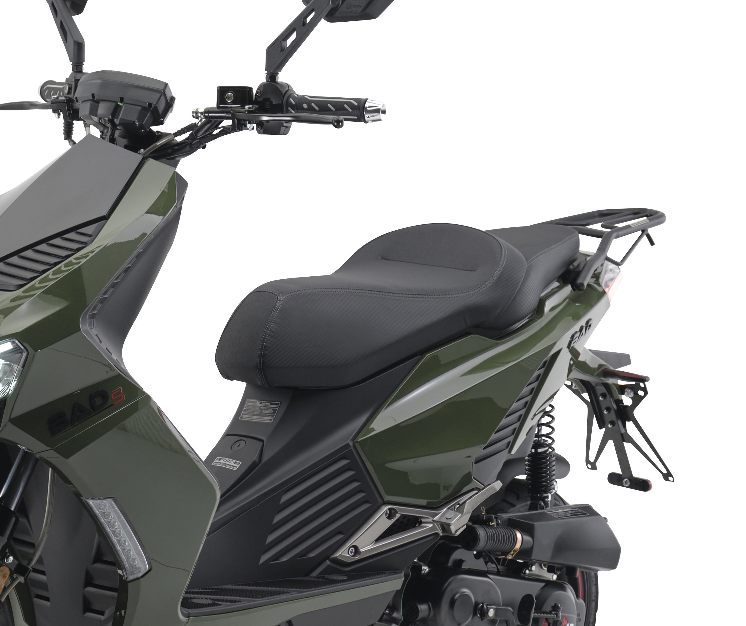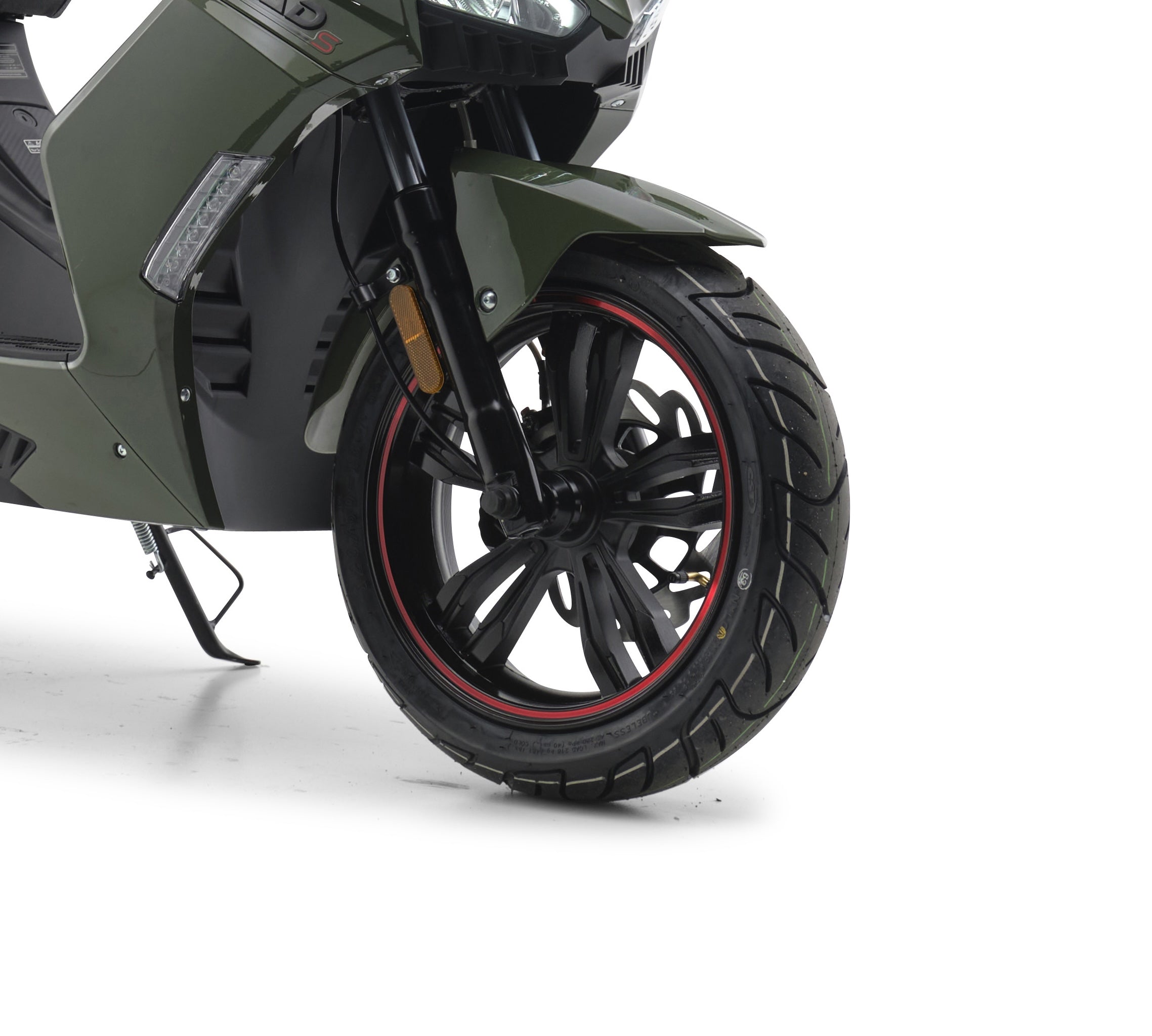 Für seine 50ccm beschleunigt das Modell auf den ersten Metern ordentlich, aber nicht zu schnell. Das sorgt für mehr Kontrolle und ein gutes Gefühl beim Starten. Einmal in Schwung, befindest Du dich dann umgehend auf der Überholspur und erreichst schnell die 45 km/h betragende Spitzengeschwindigkeit. Die hydraulischen Scheibenbremsen vorne und hinten sind für das nötige Sicherheitsgefühl verantwortlich, die LED-Beleuchtung dafür, dass Du zu später Stunde gut siehst und noch besser gesehen wirst. Serienmäßig gehören außerdem eine Alarmanlage und „Keyless Go“ zur Ausstattung.