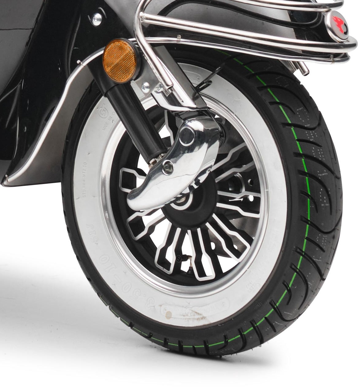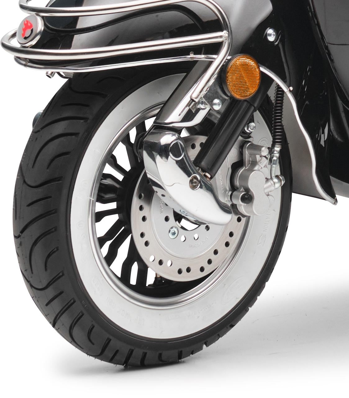 Für die passende Optik sorgt das Chrom-Paket, das die Seitenplanken und den Motorblock umfasst. Abgerundet wird das elegante Gesamtbild durch die Weißwandreifen und die Alu-Speichenfelgen.