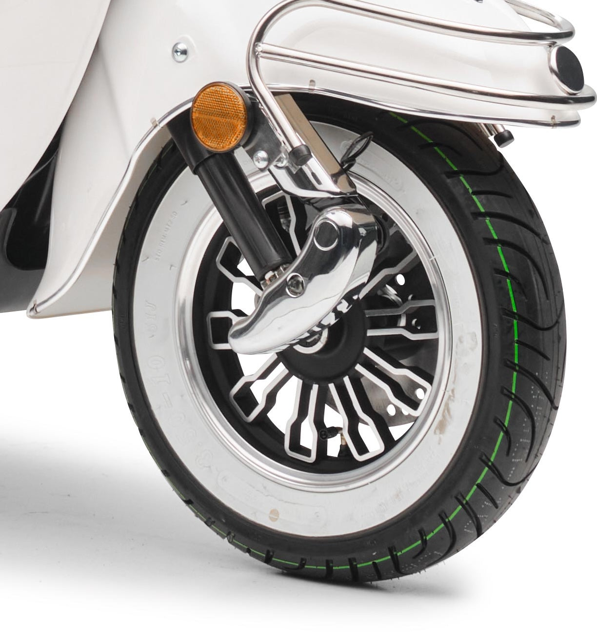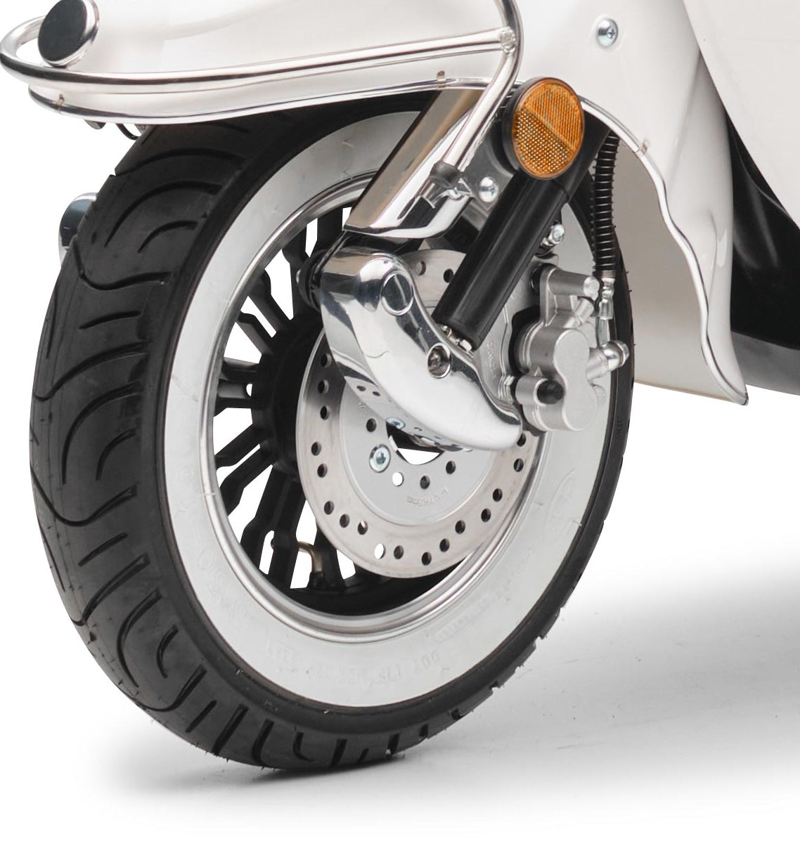 Für die passende Optik sorgt das Chrom-Paket, das die Seitenplanken und den Motorblock umfasst. Abgerundet wird das elegante Gesamtbild durch die Weißwandreifen und die Alu-Speichenfelgen.