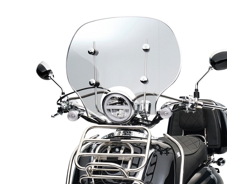 Besonders im Sommer oder bei windigem Wetter praktisch: der Windschild. Dank ihm hast Du eine angenehme Sicht nach vorne. Wenn Du mal Deine Sonnenbrille im Flur oder dem Bürotisch hast liegen lassen, verhindert er, dass die kleinen Tierchen nicht in Deinem Gesicht landen. Ein weiteres praktisches Extra: Wenn Dein Handyakku sich dem Ende zuneigt, kannst Du es dank des serienmäßigen USB-Ports während Deiner Fahrt aufladen. Alles, was Du dafür benötigst, ist ein Kabel mit dem passenden Anschluss.