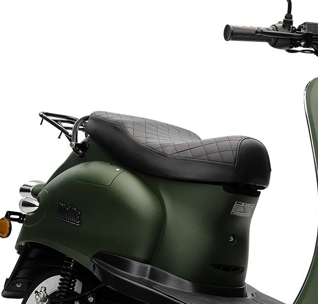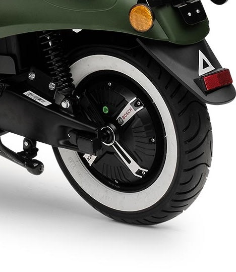 Ein hoher Spaßfaktor ist garantiert, wenn du mit deinem MiniMe ins Büro oder Kino fährst – und das mit gutem Gewissen. Der Elektro Roller bringt dich zuverlässig und klimafreundlich zu allen deinen Zielen in der Stadt. Da fällt der Verzicht auf das Auto nicht schwer und du kannst gleichzeitig etwas für die Umwelt tun. Der Motorroller ist mit seiner Farbgebung, der schwarzen Sitzbank, den Aluguss-Felgen und der angesagten Retro-Optik ein echter Hingucker. Dazu passt auch die extravagante, stylishe LED Tachoeinheit und die nostalgischen Seitenreflektoren. Der umweltfreundliche E-Scooter hat als Hinterradantrieb einen leistungsstarken, wartungsfreien und bürstenlosen Bosch-Radnabenmotor mit maximal 2000 Watt, also 2,3-2,5 PS, und kommt damit schnell auf seine Höchstgeschwindigkeit von 45 km/h. Er ist zudem auf 25 km/h drosselbar, falls Du ihn mit einer Fahrerlaubnis nach Klasse AM nutzen möchtest. Du brauchst für deinen MiniMe lediglich ein Versicherungskennzeichen und natürlich einen Helm – schon kann es losgehen.