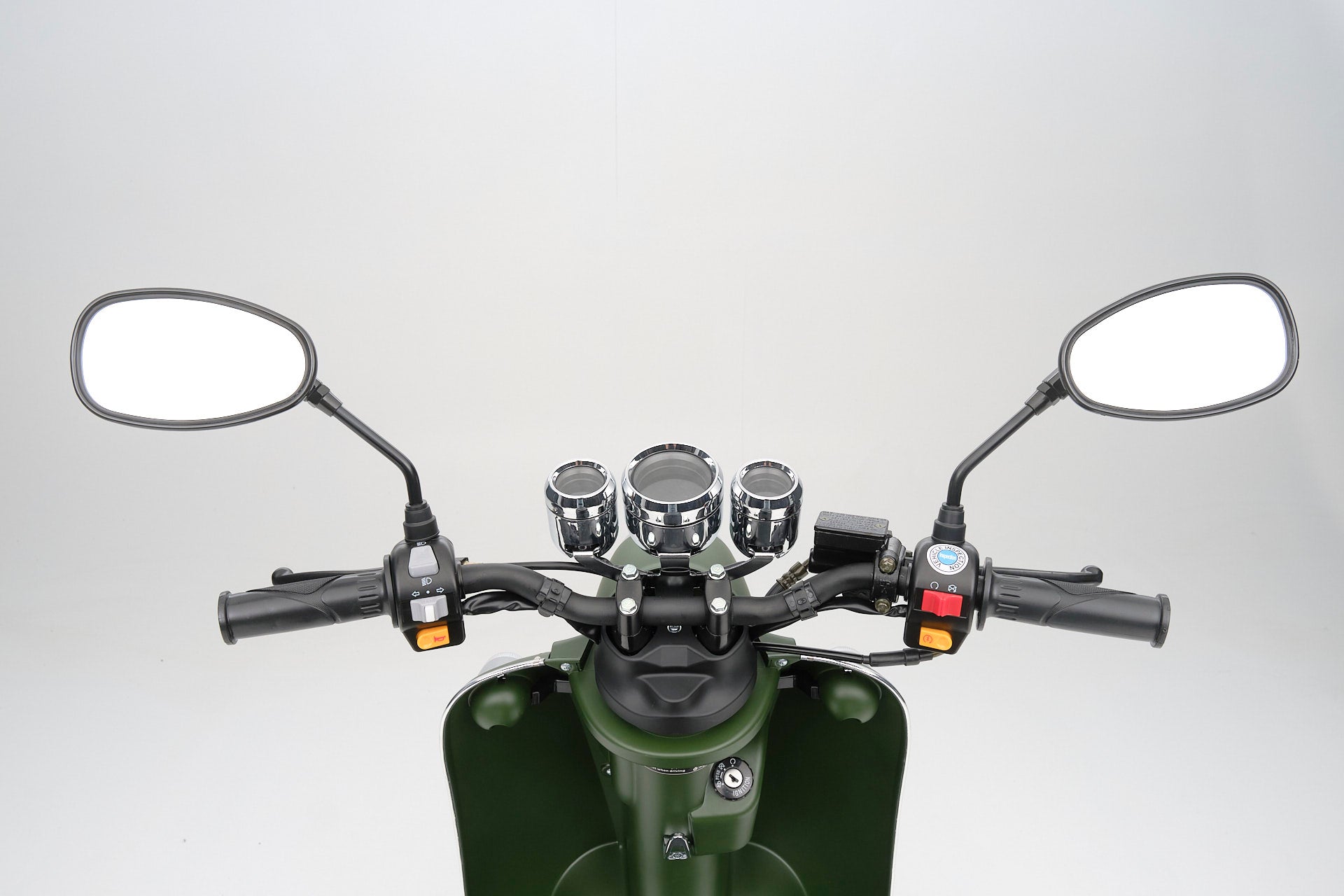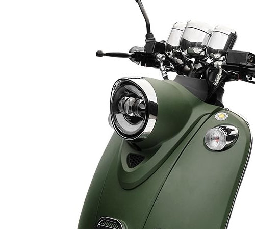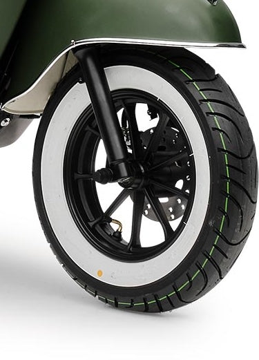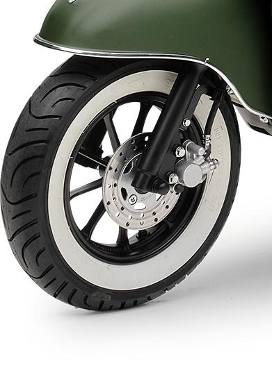 Mit dem herausnehmbaren und wiederaufladbaren Lithium-Ionen-Akku mit 60 Volt und 30 AH kommst du je nach Fahrweise pro Akku bis zu 67 Kilometer weit. Natürlich sind Reichweite und Höchstgeschwindigkeit auch vom Gesamtgewicht abhängig. Der Roller ist für 2 Personen zugelassen. Daher kannst du für längere Touren in dem praktischen Doppelakkufach einen zweiten geladenen Akku mitnehmen. Zum Laden braucht der Akku etwa 6 Stunden. Noch ein paar Worte zum Thema Sicherheit: Der Retro Roller ist mit zwei Seitenspiegeln und einem hellen LED Frontlicht ausgestattet, das die Straße vor dir gut ausleuchtet. Das Rücklicht sorgt dafür, dass du auch bei Dunkelheit von Autofahrern gesehen wirst. Mit den hydraulischen Scheibenbremsen vorne und hinten bist du auf der Straße sicher unterwegs und kannst auf unerwartete Situationen schnell reagieren.
