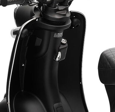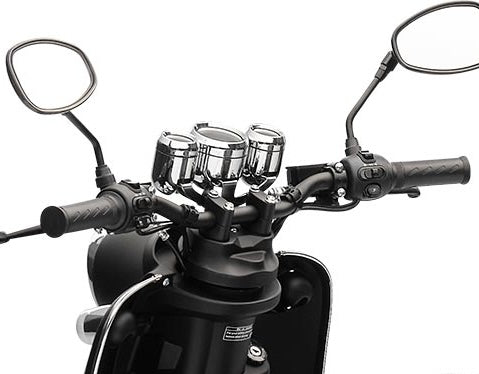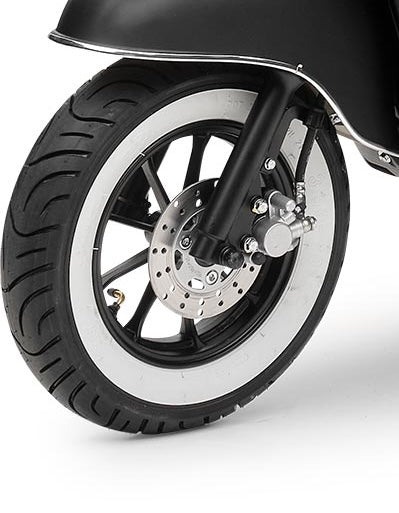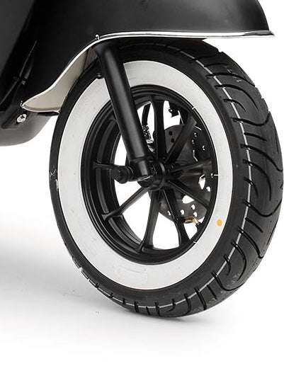 Mit dem herausnehmbaren und wiederaufladbaren Lithium-Ionen-Akku mit 60 Volt und 30 AH kommst du je nach Fahrweise pro Akku bis zu 67 Kilometer weit. Natürlich sind Reichweite und Höchstgeschwindigkeit auch vom Gesamtgewicht abhängig. Der Roller ist für 2 Personen zugelassen. Daher kannst du für längere Touren in dem praktischen Doppelakkufach einen zweiten geladenen Akku mitnehmen. Zum Laden braucht der Akku etwa 6 Stunden. Noch ein paar Worte zum Thema Sicherheit: Der Retro Roller ist mit zwei Seitenspiegeln und einem hellen LED Frontlicht ausgestattet, das die Straße vor dir gut ausleuchtet. Das Rücklicht sorgt dafür, dass du auch bei Dunkelheit von Autofahrern gesehen wirst. Mit den hydraulischen Scheibenbremsen vorne und hinten bist du auf der Straße sicher unterwegs und kannst auf unerwartete Situationen schnell reagieren.